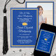 Partagez la joie d'un baccalauréat ou d'un collège avec photo personnalisée, annonces en bleu, or et blanc. Ce modèle de style formel comprend les noms des parents et des diplômés, ainsi que tout libellé de votre choix, comme les détails de l'invitation du parti, les distinctions spéciales, le titre du diplôme, la citation inspirante préférée, les coordonnées du diplômé, les plans d'études futurs ou le nouveau poste. Tout le texte sur ce modèle est simple à personnaliser. Le design bordé de bleu et de jaune comprend un casquette en carton de mortier, une calligraphie de script élégante, une typographie traditionnelle classique et une photo de votre choix, comme une image principale ou une image de la cérémonie de début. Veuillez noter que l'or est imprimé en couleur et non en métal. Ces cartes de faire-part de remise de diplômes sont une façon élégante de partager votre fête spéciale avec votre famille et vos amis. Félicitations au diplômé !