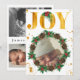 Annonce de photo de Noël personnalisée pour bébé en or. Belle aquarelle élégante avec branches de pin, pommes de pin et houx. Vous pouvez personnaliser le texte et ajouter vos photos préférées. Effet numérique or faux.