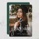 Célébrez votre diplôme d'études secondaires ou collégiales avec ce faire-part vertical de diplôme en une photo. Le script moderne "gradué" sur l'avant en blanc est parfait pour une grille tendance. Le dossier est vert foncé avec un motif subtil, mais la couleur peut être changée en n'importe quelle couleur d'école en cliquant sur "personnaliser".