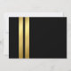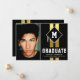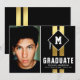 Carte d'annonce de remise de diplômes pour homme moderne avec 2 bandes de papier d'or faux sur un fond noir tendance, une photo de l'enfant, un bonnet de diplômé avec l'initiale du diplômé sur le dessus, et un modèle d'annonce facile à personnaliser.