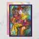 Peinture à l'aquarelle figurative contemporaine colorée, fantaisiste et musicale en rouge, bleu, jaune, au dos de la carte avec une rose rouge dorée. Pierrot, un violoniste romantique au clair de lune avec un chat et un hibou. Personnage du Carnaval de Venise. Peinture à l'aquarelle 1990. Ce design cool et artistique est également une belle invitation pour Noël, les vacances, les occasions spéciales, les mariages, les fêtes d'anniversaire, la saison de Mardi Gras, le bal masqué du Nouvel An, la Saint-Valentin.