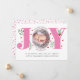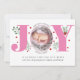 Pink Joy with berries Première photo de Noël Fille faire-part de naissance. Il montre le mot "JOY" avec des baies rouges et de la verdure tandis que au lieu de la lettre "O" il y a votre photo. Le dos est composé de pois roses.