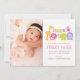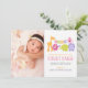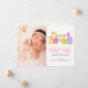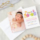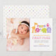 Une parade d'amis animaux de la jungle — lion, girafe, oiseau, singe, éléphant et hippopotame — souhaite la bienvenue à votre petite fille sur cette carte de naissance au format portrait safari ravissante. La photo de portrait est entourée d'accents à motifs à pois et à rayures sur un fond blanc épuré avec des touches de rose, de vert, d'orange et de violet vibrants. Tout le texte est entièrement personnalisable.