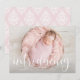Présentation du Faire-part de naissance photo de superposition de script manuscrit | Célébrez et présentez-vous un nouveau paquet de joie avec ce faire-part de naissance photo personnalisable. Il comporte une superposition manuscrite de script et un motif damassé à l'encre rousse.
