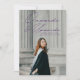 Faire-part moderne de graduation avec photo verticale du diplômé avec "En avant et en haut" dans un script manuscrit violet. Personnalisez le devant du faire-part de remise de diplômes en y ajoutant le nom du diplômé, l'école et l'année de fin d'études. Le faire-part inverse pour afficher une photo supplémentaire avec les plans futurs du diplômé, les détails de la fête de grad, etc. montré ci-dessous.