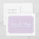 Moderne et chic Mariage tout simple et élégant Enregistrer la date Carte postale avec un design élégant d'emblème de ticket lavande. Ce design classique et élégant est facile à customiser avec vos détails mariages. Pour plus d'options de personnalisation, cliquez sur Personnaliser.