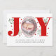 Red Joy avec baies Première photo de Noël Vacances bébé faire-part de naissance. Il montre le mot "JOY" avec des baies rouges et de la verdure tandis que au lieu de la lettre "O" il y a votre photo. Le dos comprend des pois rouges.