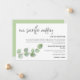 Pour les moments où une cérémonie de mariage plus petite et socialement distante est essentielle et que vous souhaitez faire savoir à vos invités que vous réduisez la taille et les invitez à la diffusion en direct à la place, ce design contemporain présente une élégante branche de feuilles d'eucalyptus dans le coin inférieur gauche et un script élégant d'écriture manuscrite moderne avec Notre mariage intime en haut. Le reste du texte, qui est aligné à droite, vous pouvez facilement le personnaliser avec vos informations. Vous pouvez également changer la couleur de fond verte coordonnée au verso en une autre couleur si vous le souhaitez via l'option Personnaliser davantage.