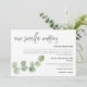 Pour les moments où une cérémonie de mariage plus petite et socialement distante est essentielle et que vous souhaitez faire savoir à vos invités que vous réduisez la taille et les invitez à la diffusion en direct à la place, ce design contemporain présente une élégante branche de feuilles d'eucalyptus dans le coin inférieur gauche et un script élégant et moderne avec "Notre mariage intime" en haut. Le reste du texte, qui est aligné à droite, vous pouvez facilement le personnaliser avec vos informations. Vous pouvez également changer la couleur de fond verte coordonnée au verso en une autre couleur si vous le souhaitez via l'option "Personnaliser davantage".