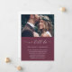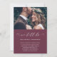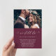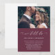 Élégant bordeaux et blanc changent la date d'annonce de report de mariage. Cette annonce simple est une façon chic de faire savoir aux invités que la date de votre mariage a été reprogrammée en raison de circonstances imprévues, et comprend la nouvelle date de mariage. Cette annonce tendance présente une belle écriture calligraphique blanche "nous sommes toujours mariés" sur un fond bordeaux marsala avec la photo du couple, et un dos de carte blanc.