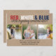 Faire-part de grossesse à thème rouge blanc et bleu avec 3 de vos photos préférées et votre message personnalisé. Le design est basé sur un arrière - plan naturel rustique, kraft texturé. Il contient le libellé "Rouge Blanc & Bleu nous attendons à quelqu'un de nouveau!" dans les imprimés modernes surdimensionnés et la typographie manuscrite à double balayage. Thème rustique américain et parfait pour les annonces de grossesse du 4 juillet.