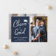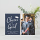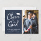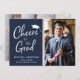 Carte de faire-part moderne de graduation photo bleu foncé 2. Le devant présente la photo du diplômé, "Cheers to the Grad" dans un script blanc moderne, et une illustration blanche du grand casquette. Personnalisez facilement avec le nom du diplômé et l'école, et ajoutez une autre photo au dos.