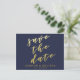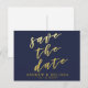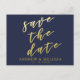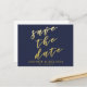 NouvelleAlléeParc - Carte postale élégante, avec 'Sauvegardez la date' en typographie élégante de faux or à feuilles, sur un fond bleu marine. Facile à personnaliser dans Zazzle avec vos propres noms, date ou autre texte pour une conception personnalisée. Tous les styles de texte, couleurs et tailles peuvent être modifiés pour répondre à vos besoins. Vous pouvez également changer la couleur de fond en n'importe quelle couleur que vous préférez.