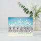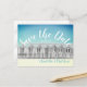 Sauver la date carte postale anglaise de cabine de plage en bleu et jaune.