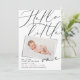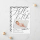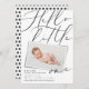 Bonjour petit un faire-part de naissance photo moderne 1. Elégant script typographie texte de conception, effet photo imprimé moderne. Polka noir blanc monochrome conception de fond de pôle.