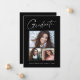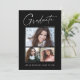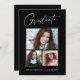 Cartes de graduation "3 photo" propres, tendance, modernes et élégantes, avec éléments de design de texte moderne avec un script d'encre calligraphie unique. Les photos du diplômé sont accentuées avec une délicate et minimaliste descente de pensionnat. Le verso de la carte offre des espaces de texte personnalisés pour des informations sur votre diplôme. Noir et blanc ou customiser facilement l'arrière - plan pour correspondre à la couleur primaire de votre école ou à n'importe quelle couleur de votre choix. Idéal pour les personnes âgées du secondaire, du collège et de l'université.