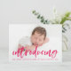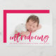 Carte de faire-part de naissance photo moderne avec photo horizontale de nouveau-né de votre bébé avec "introduction" affiché dans une superposition de script de brosse magenta. Personnalisez l'avant des annonces de naissance simples avec le nom du bébé et les statistiques de naissance. La carte s'inverse pour afficher un arrière - plan magenta solide avec de l'espace pour des photos et du texte supplémentaires.