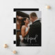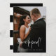 Nous avons fui ! Annoncez votre mariage à votre famille et à vos amis avec cette carte simple et moderne. Il présente une écriture manuscrite blanche superposée avec des rayures noires et blanches. Personnalisez en ajoutant les noms, la date, le lieu et une photo.