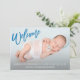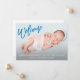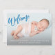 Cette faire-part de naissance moderne pour bébé est dotée d'un doux "bienvenue" en typographie de pinceau bleu et comprend une photo du nouveau-né avec les stats du bébé sur le devant de la carte. Le dos de la carte est blanc, parfait pour un bébé.