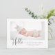 Une carte simple et élégante photo modèle de naissance faire-part recto-verso comprend une photo de votre nouveau-né garçon ou fille, message personnalisé qui peut être personnalisé, texte de typographie écrit à la main qui dit "Bonjour" avec un script merci et coeur entre - au-dessus de votre message sur le dos. Vous pouvez customiser le nom et les statistiques du bébé à l'avant et vous remercier du message au dos de la carte. Un endroit pour une deuxième photo à l'arrière. ©Marisu Valencia