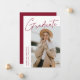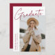 Carte de faire-part moderne de graduation avec une des photos du diplômé sur le devant avec "Graduate" dans une écriture manuscrite rouge crimson avec un arrière - plan blanc. Personnalisez avec le nom du diplômé, le nom de l'école et l'année de fin d'études. La faire-part minimaliste de graduation inverse pour afficher 4 photos dans une mise en page de type grille avec les plans du diplômé ou d'autres textes personnalisés ci-dessous. Le faire-part de 5 diplômes photo est parfait pour les diplômés du secondaire et du collège.