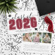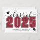 Une faire-part de graduation horizontale classique mais moderne. L'avant présente un "Class of" surdimensionné en noir gras avec "2025" en rouge frappant pour un contraste éclatant, accentué par un élégant script gris. Deux icônes de casquette de fin d'études ajoutent une touche festive, avec un espace en dessous pour le nom du diplômé et l'école. Les couleurs peuvent être customisées pour correspondre aux couleurs de l'école pour un look personnalisé. Le dos présente un collage photo avec trois taches d'image et un espace pour un message sincère des parents, mettant en évidence les réalisations et exprimant la fierté.