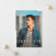 Carte de faire-part moderne de diplôme garçon avec un design simple et masculin avec "Graduate" en gros caractères gras avec le nom du diplômé, l'année et le nom de l'école sur votre photo verticale de fond de sang préféré. Le côté arrière a une photo carré avec votre message personnel ci-dessous dans une police marine bleu serif sur un arrière - plan blanc.