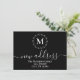 Simple et élégant fond noir avec un délicat monogramme de couronne botanique blanc, typographie blanche pour les détails de la nouvelle adresse.