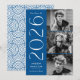 Célébrez la réussite de votre diplômé avec cette moderne annonce de remise de diplômes de la promotion 2026, conçue dans un style Art déco épuré. Le recto de l'annonce présente trois photos du diplômé disposées verticalement le long du côté droit, associées au chiffre « 2026 » affiché en lettrage Art déco blanc et net sur un fond bleu classique. Personnalisez l'annonce avec le nom du diplômé et de son école pour créer un souvenir significatif et élégant. Le verso de l'annonce présente un motif géométrique tourbillonnant bleu et blanc coordonné, complétant le design contemporain. Parfait pour les remises de diplômes de lycée et d'université, cette annonce de remise de diplômes multi-photos offre une façon élégante de partager l'étape importante de la promotion 2026.