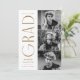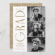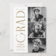 Faire-part de graduation élégante avec les trois photos du diplômé situées à droite du design dans une mise en page verticale. "Grad" est présenté en laiton, lettrage art déco moderne. Personnalisez le faire-part moderne de diplôme en photo en ajoutant le nom du diplômé, l'année de diplôme et le nom de l'école. Le design inverse pour afficher un arrière - plan en laiton et blanc géométrique tourbillon. Parfait pour les bacheliers et collégiaux !