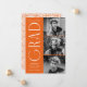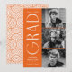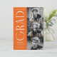 Faire-part de graduation élégante avec les trois photos du diplômé situées à droite du design dans une mise en page verticale. Le " Grad " est présenté en blanc, de style art déco moderne, avec un arrière - plan orange. Personnalisez le faire-part moderne de diplôme en photo en ajoutant le nom du diplômé, l'année de diplôme et le nom de l'école. La conception inverse pour afficher un arrière - plan tourbillon géométrique orange et blanc. Parfait pour les bacheliers et collégiaux !