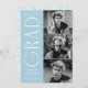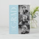 Faire-part de graduation élégante avec les trois photos du diplômé situées à droite du design dans une mise en page verticale. "Grad" est présenté en lettres Art déco blanches et modernes avec un arrière - plan bleu ciel. Personnalisez le faire-part moderne de diplôme en photo en ajoutant le nom du diplômé, l'année de diplôme et le nom de l'école. Le design inverse pour afficher un arrière - plan tourbillon géométrique bleu ciel et blanc. Parfait pour les bacheliers et collégiaux !