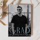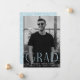 Faire-part de graduation simple avec la photo verticale du diplômé avec "Grad" affichée en lettres bleu clair, art déco moderne. Personnalisez l'avant du faire-part de remise de diplômes en photo unique en ajoutant le nom du diplômé, son école et son année d'études. La faire-part s'inverse pour afficher un design tourbillon géométrique bleu ciel et blanc.
