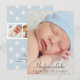 Tout simplement adorable carte d'annonce de naissance photo avec le nom du bébé garçon dans un script de calligraphie élégant avec des statistiques de naissance en gris charbon se superposant sur une photo de portrait en pleine page. Le verso présente une bande de collage à trois photos sur un motif à pois doux bleu bébé et blanc avec un message "Avec amour, Parents fiers". Toutes les couleurs de texte et le fond à pois sont entièrement personnalisables.