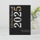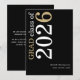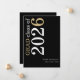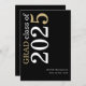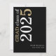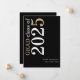 White Gold Text 2025 Black Graduation Faire-part. Un design typographique moderne et élégant pour annoncer la nouvelle de votre diplômé, avec une grande typographie stylisée pivotée et à gauche en haut en blanc et or sur un arrière - plan noir classique. Personnalisez facilement le reste du texte. y compris votre message au verso
