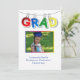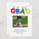 Un carte photo mignon pour annoncer la remise des diplômes de votre enfant de l'école maternelle, de la maternelle ou de l'école secondaire. Design utilise le mot "GRAD" dans des couleurs vives et primaires accrochées à une chaîne avec des clips en papier. Le cadre photo a une bordure arc-en-ciel. Il suffit de télécharger votre image spéciale et de customiser le texte pour un memento spécial.