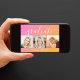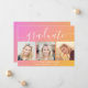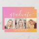 Carte faire-part tendance avec un arrière - plan dégradé rose à orange, trois photos de la grade, "diplômé" en écriture blanche stylisée avec des swashes et leur nom, l'école et l'année de classe dans une simple typographie blanche moderne.