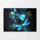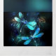 Deux libellules transparentes, lumineuses, turquoise, artistiquement dessinées sur l'arrière - plan de nuit avec des algues luminescentes et des lucioles. libellule éclatante.