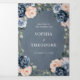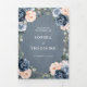 Invitation de mariage géométrique floral bleu poussiéreux avec des bouquets élégants de bleu poussiéreux/navire, de blanc, de rose pêche et de feuilles d'eucalyptus vert sauge et un cadre géométrique neutre avec paillettes élégant. N'hésitez pas à me contacter pour toute aide de personnalisation ou si vous avez besoin d'un autre produit avec ce design.
