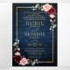 Invitation de mariage géométrique florale bleu marine et bourgogne foncé présentant un élégant bouquet de bleu marine, bleu roi, blanc, rose, bourgogne, rose marsala et feuilles d'eucalyptus vert sauge et cadre géométrique neutre à paillettes dorées élégant. N'hésitez pas à me contacter pour toute aide de personnalisation ou si vous avez besoin d'un autre produit avec ce design.