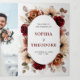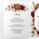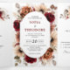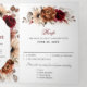 Invitation de mariage au thème floral terreux élégant rouge bordeaux, terracotta, orange avec un bouquet élégant de roses bordeaux, pivoines couleur terracotta et feuilles d'eucalyptus vertes. N'hésitez pas à me contacter pour toute aide de personnalisation ou si vous avez besoin d'un autre produit avec ce design.