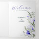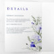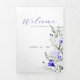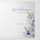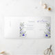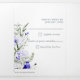 La faire-part mariage triple présente un beau design floral avec des fleurs bleues royales et en ivoire, complétées par des accents verts de feuillage. Le panneau central, qui sert de couverture avant, accueille chaleureusement les clients avec les noms du couple en écriture élégante. Le panneau de gauche fournit des informations détaillées sur l'événement, y compris l'emplacement et l'hébergement, tandis que le panneau de droite inclut la date, l'heure et les détails du mariage. Ce design est parfait pour une faire-part de mariage formelle et esthétique.
