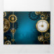 Arrière - plan turquoise, texturé, steampunk avec des engrenages en laiton et or, une clé en argent et l'horloge. Style Steampunk.