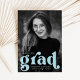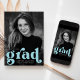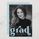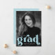 Annonces de fin d'études élégantes avec la photo verticale du diplômé avec "grad" en gras bleu ciel. Personnalisez le faire-part de remise de diplômes en photo en ajoutant le nom du diplômé, l'année de remise de diplômes et l'école. La faire-part s'inverse pour afficher un motif d'arc rétro bleu ciel et blanc.