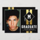 Carte de faire-part de graduation de type moderne avec 2 faux bandes de papier doré sur un arrière - plan noir tendance, une photo de l'enfant, un tableau de bord avec les diplômés initiale sur le dessus, et un modèle faire-part facile à personnaliser.
