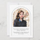 Cette faire-part de graduation minimaliste en arc noir et blanc présente une arche délicate, 2 modèles photo et une élégante typographie moderne.