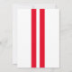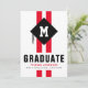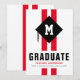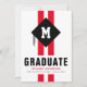 Carte d'annonce de remise de diplôme moderne pour homme avec 2 bandes sportives rouges, un chapeau de diplômé avec l'initiale du diplômé sur le dessus, le nom de l'étudiant et l'année de promotion.