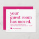 Your Guest Room Has Moved Moving Faire-part avec un script moderne et une typographie de police et un coeur. Les couleurs peuvent être changées facilement en cliquant sur personnaliser, puis cliquez pour customiser plus loin pour voir notre sélecteur de couleurs. Contactez notre magasin si vous avez besoin d'aide.