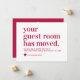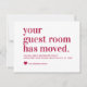 Your Guest Room Has Moved Moving Faire-part avec un script moderne et une typographie de police et un coeur. Les couleurs peuvent être changées facilement en cliquant sur personnaliser, puis cliquez pour customiser plus loin pour voir notre sélecteur de couleurs. Contactez notre magasin si vous avez besoin d'aide.