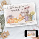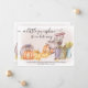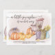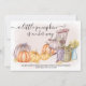 Un petit citrouille est en route, la carte Faire-part de grossesse automne - facile à personnaliser avec votre message et la date d'échéance bébé. L'aquarelle rustique a une scène de porche de campagne avec chaise à bascule, panier de rondins, carafe de blé et une récolte de citrouilles de pays. Il a un arrière - plan de lavage roux avec chaise rocking rose et Un petit citrouille est en chemin est écrit dans élégant script manuscrit.